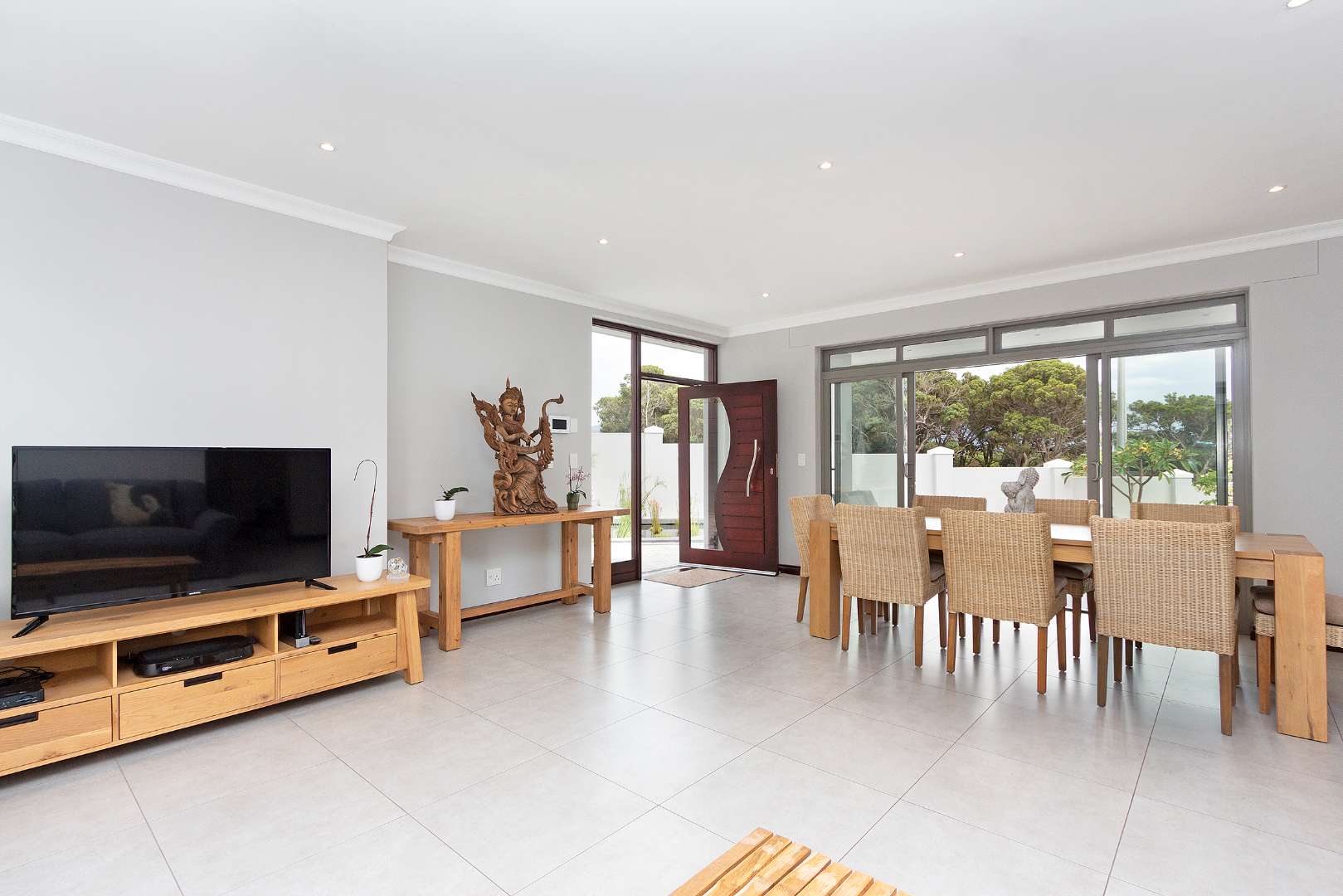 Luxurious receptions include two open plan lounge and dining areas, plus a covered outdoor braai area and upstairs balcony.
