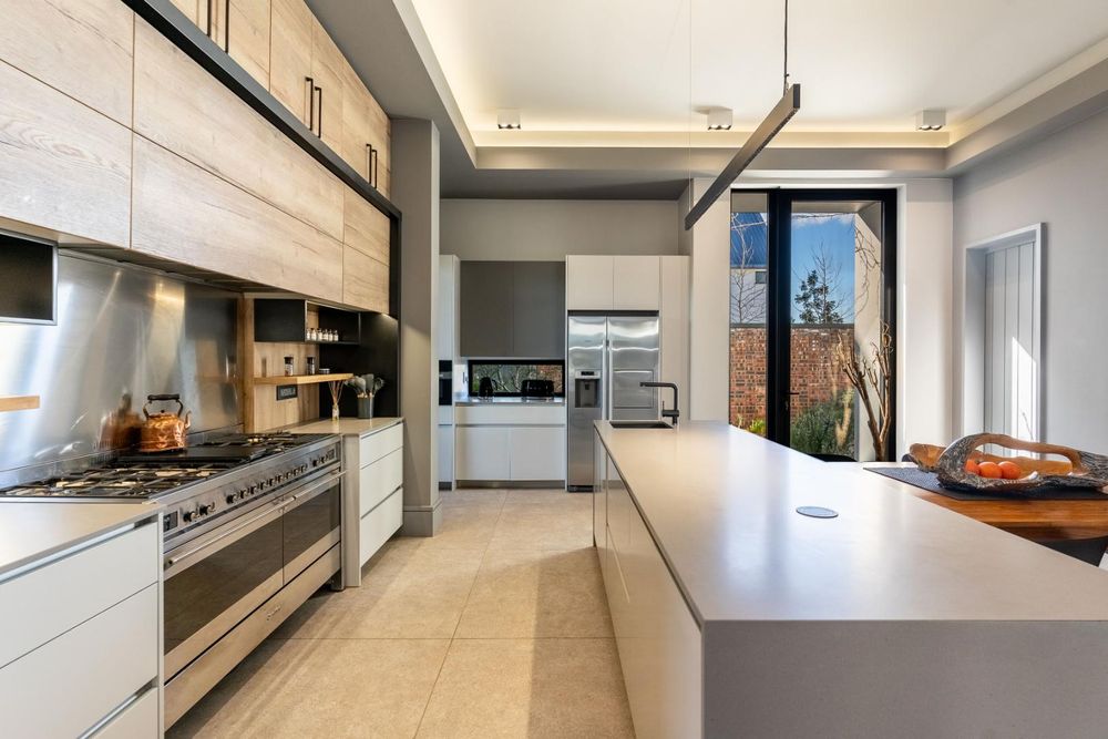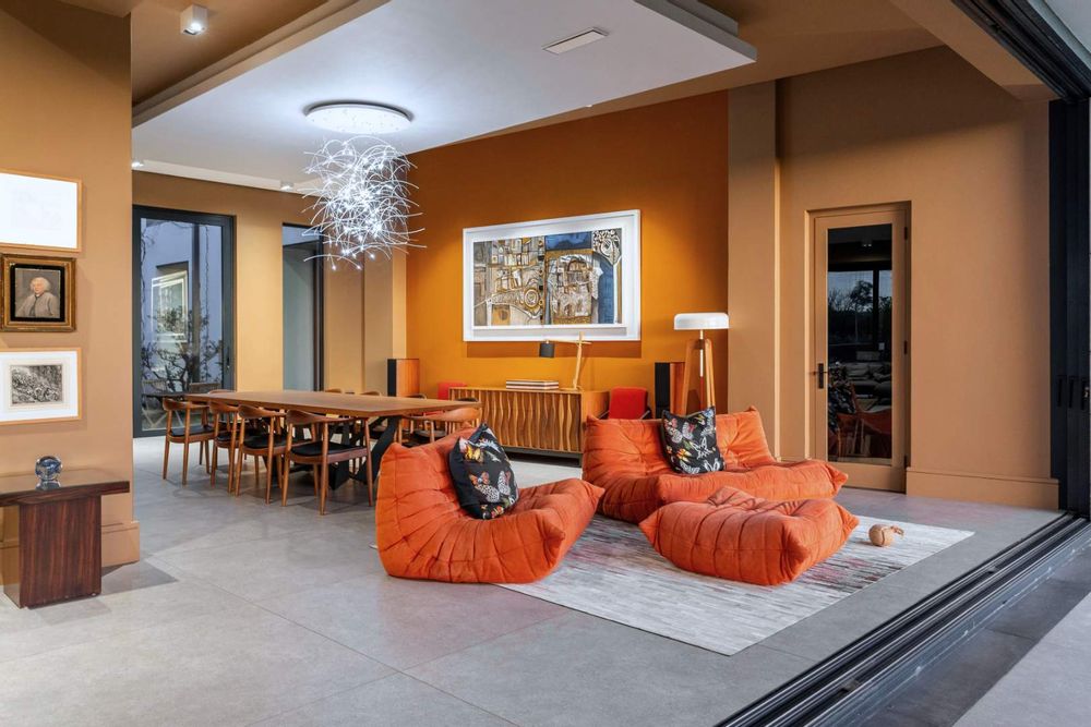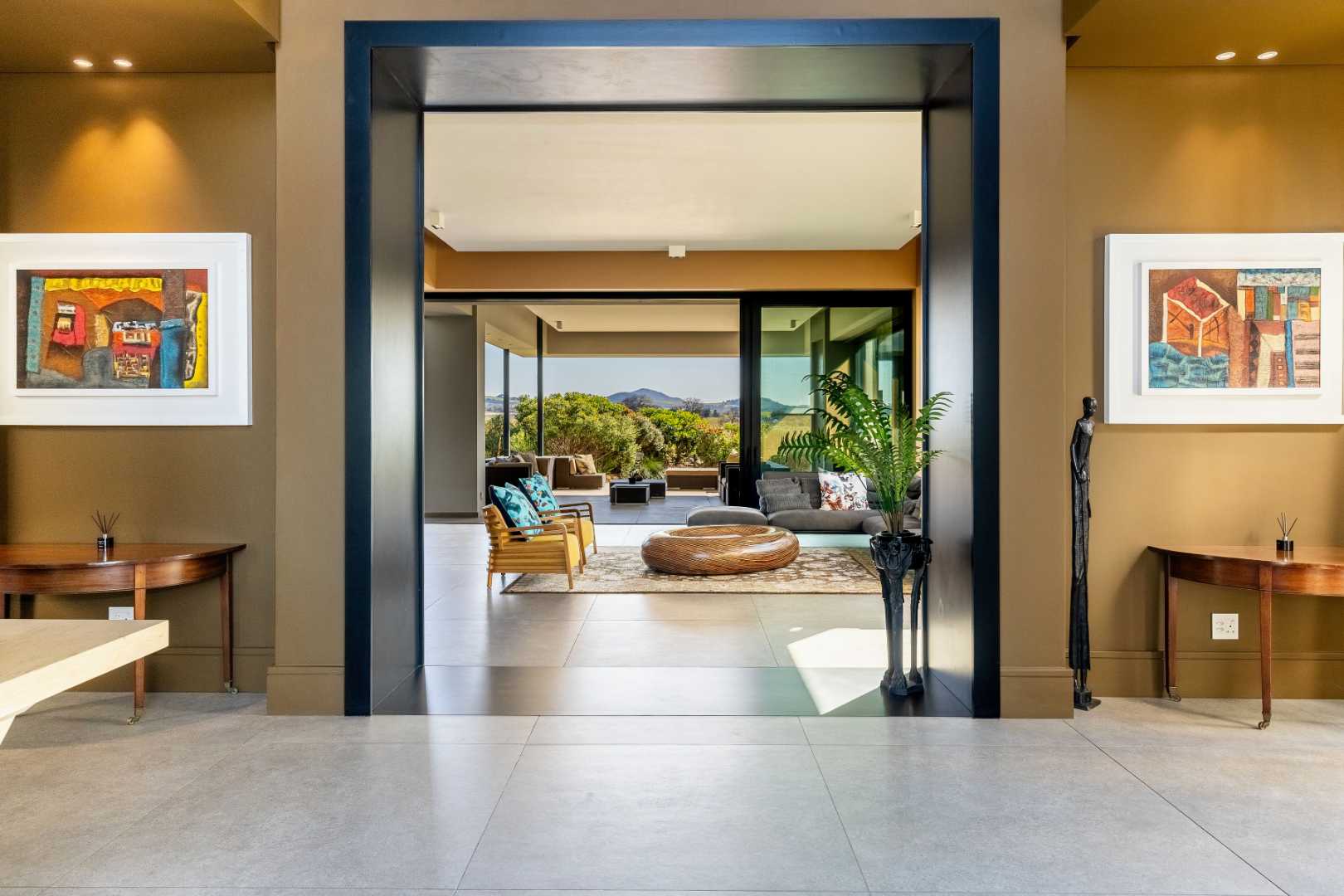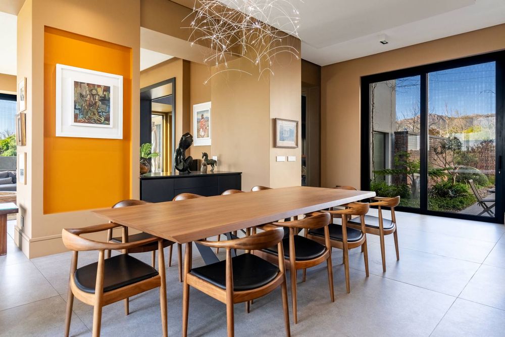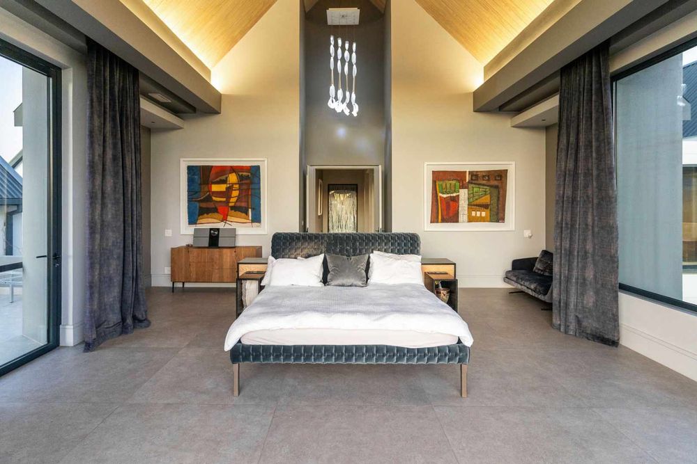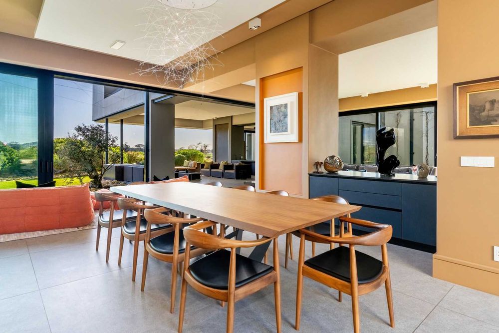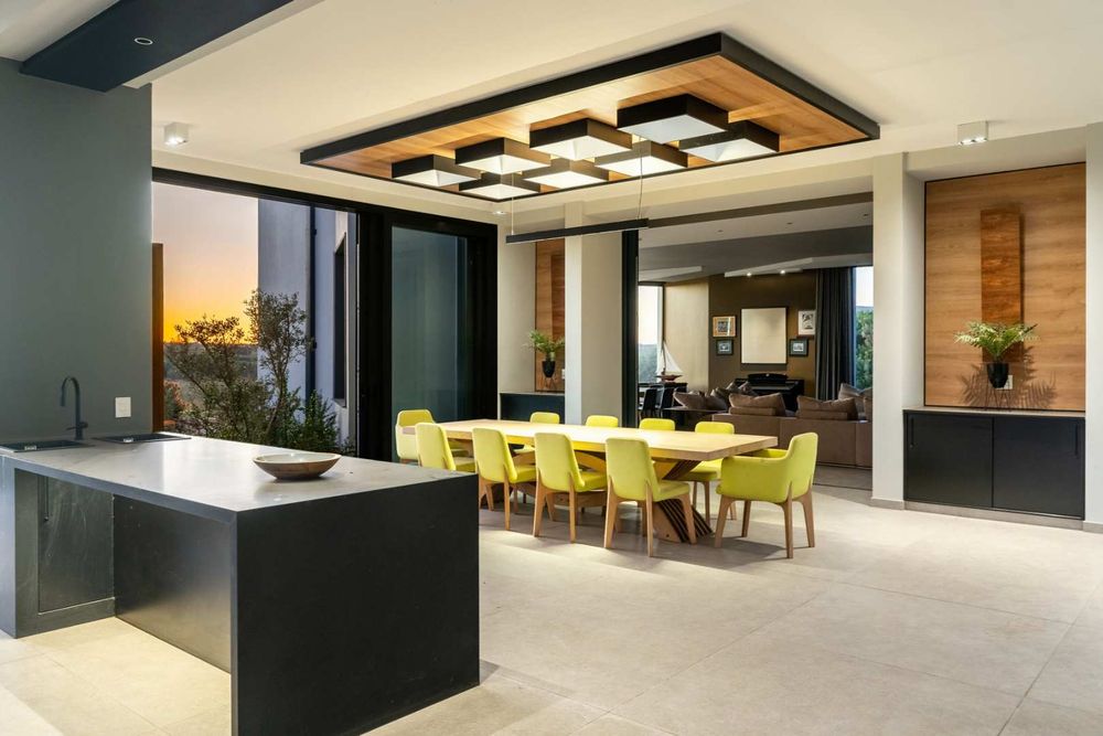 The home’s architecture embraces the natural beauty surrounding it. Double-glazed safety glass sliding doors disappear into the walls, merging the indoors with the lush, indigenous gardens and eco lake. The open-plan flow invites the outdoors in, providing an ideal setting for both intimate family moments and lavish entertaining.