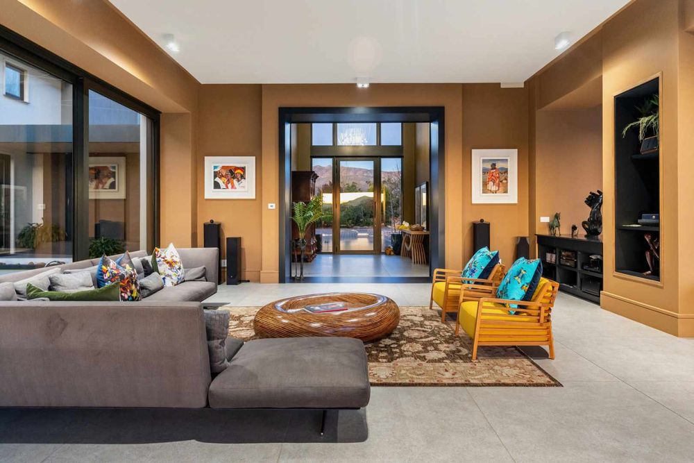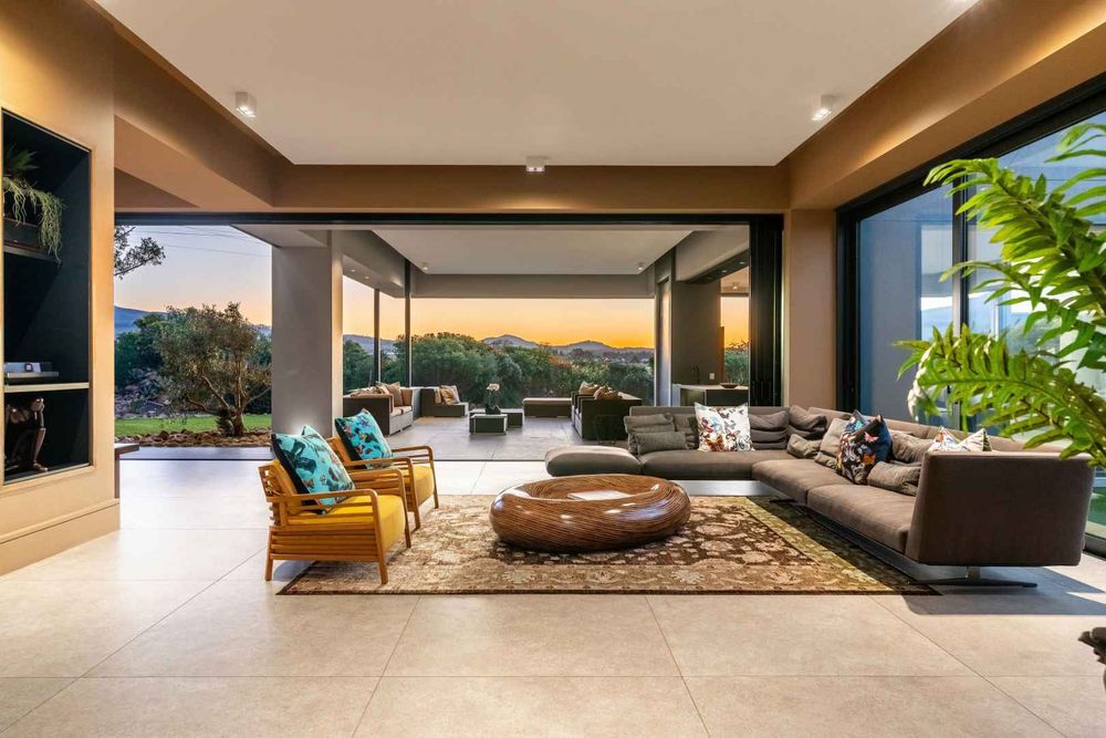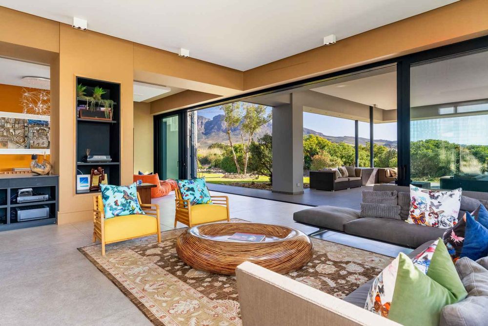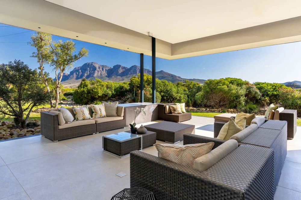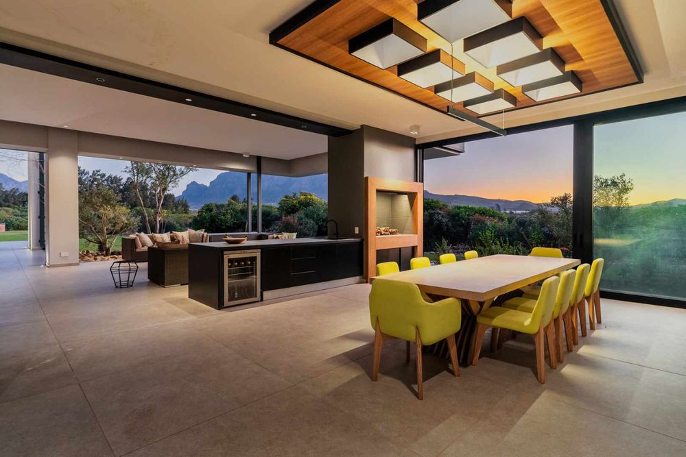This property redefines outdoor living. The firepit area features an outdoor cinema, braai, and a wood-fired hot tub, all overlooking the indigenous garden and breathtaking Simonsberg Mountains. The covered patio includes a lounge, dining area, and outdoor kitchen—ideal for al fresco dining and relaxation. A music/cinema room flows into the outdoor entertainment area.