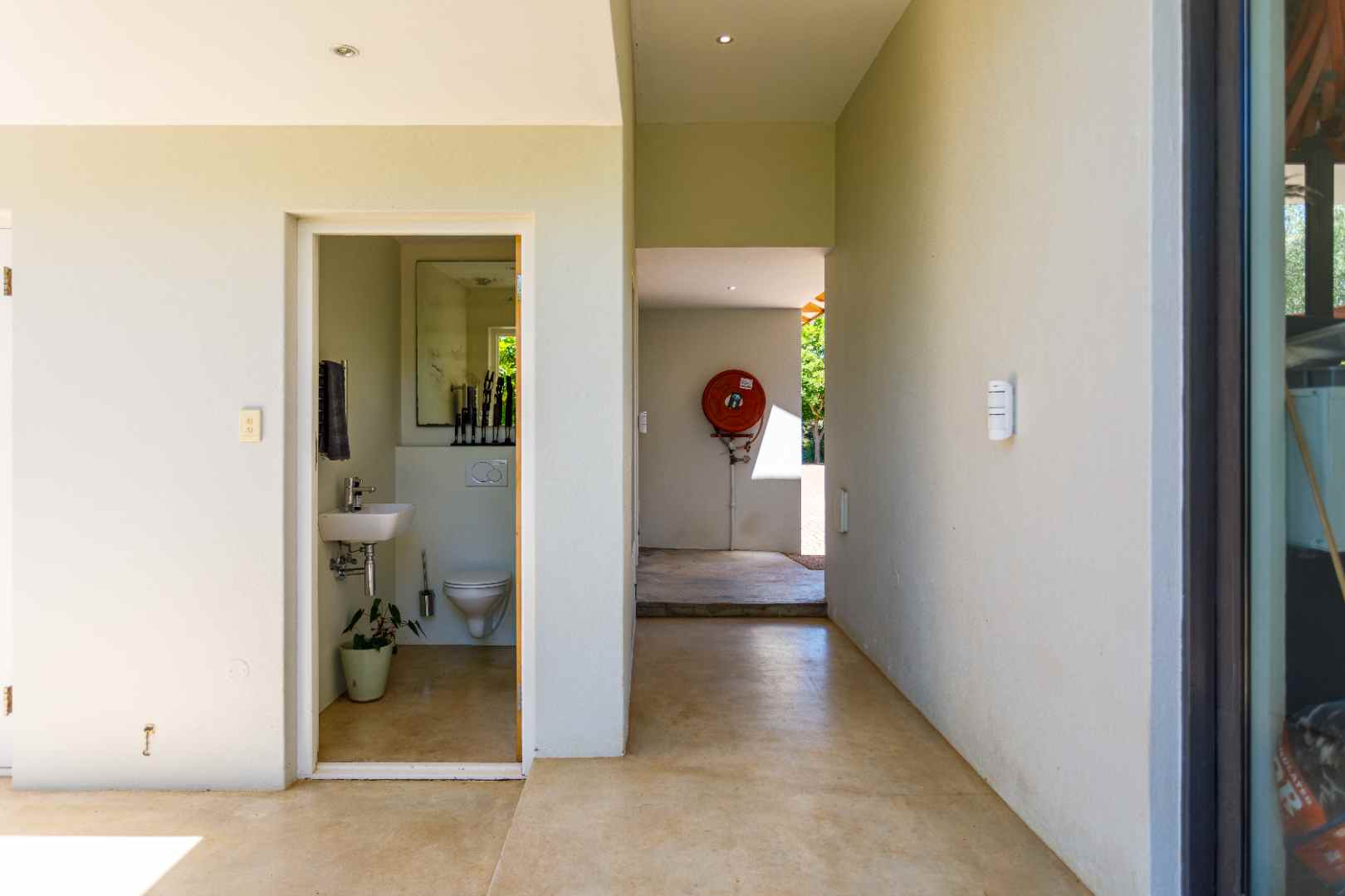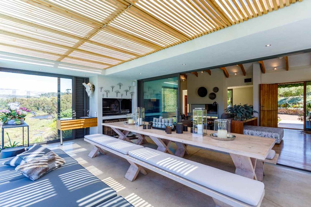 The home’s design integrates expansive picture windows and floor-to-ceiling glass doors, offering panoramic views of the Springbok dancing over the fields, the African landscape, winding Palmiet River and surrounding conservancy.